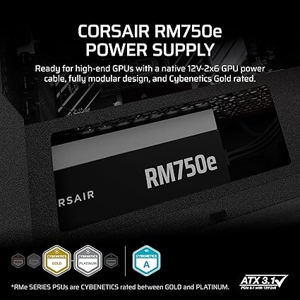 CORSAIR RM750e (2025) Fully Modular Low-Noise ATX Power Supply with 12V-2x6 Cable – ATX 3.1 & PCIe 5.1 Compliant, Cybenetics Gold Efficiency, 105°C-Rated Capacitors, Modern Standby Mode – Black