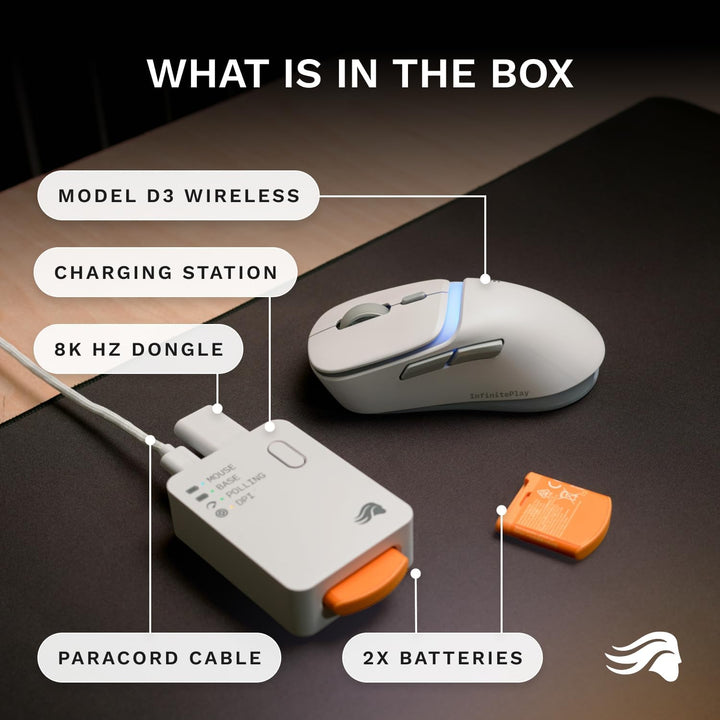 - MULTIPURPOSE 8K WIRELESS BASE - Enjoy ultra reliable 2.4GHz wireless connection, up to 8K Hz polling rate with the included base. The system doubles as the InfinitePlay charging hub showing battery charge status, polling rate and DPI settings.