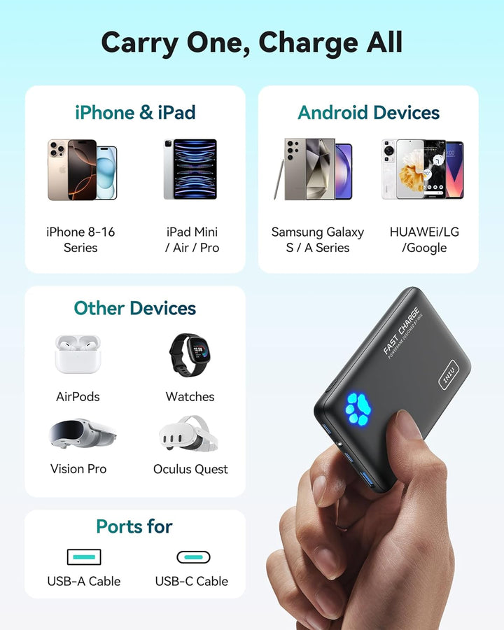- Industry First-Seen High-Density TinyCell: INIU's latest 10,000mAh power bank features the market's first high-density cell, making it 30% smaller and 15% lighter than others with the same capacity.